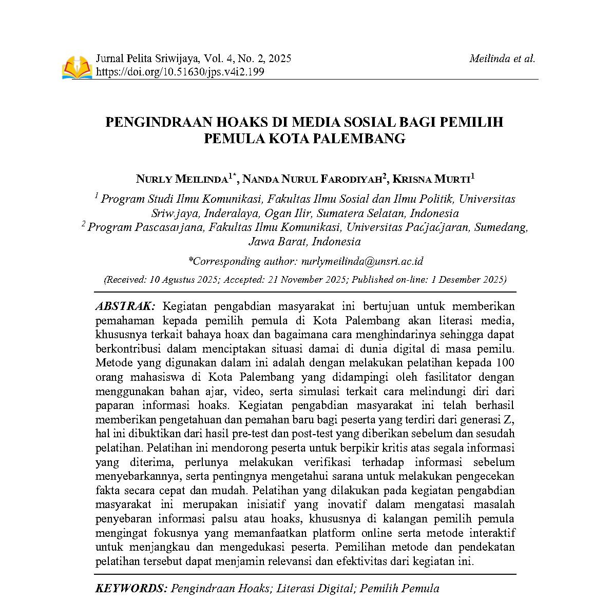 Jurnal Pelita SriwijayaJurnal Pengabdian kepada Masyarakat